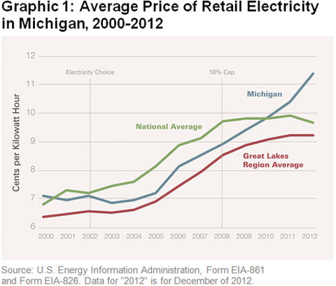 Michigan once had a very successful electricity choice program. It had its flaws, but on balance Michigan's electricity choice program led to lower electricity rates for Michigan households, small businesses, schools and employers than they would have had otherwise. Before competition was introduced, Michigan's electricity rates were well above both the national average and the regional average among Great Lakes States. By 2004, or only two years after competition was introduced, Michigan rates were below the national average, and were narrowing the gap with nearby states. After the 10 percent cap and other restrictions on competition were imposed in 2008, rates rose much faster than the national average, and by the end of 2012 rates across all categories of customers in Michigan were 18 percent above the national average and 23 percent above the regional average. Furthermore, while electricity rates on average in the United States had declined between 2008 and 2012, rates in Michigan on average were about 27 percent higher than they were when the 10 percent cap was imposed.