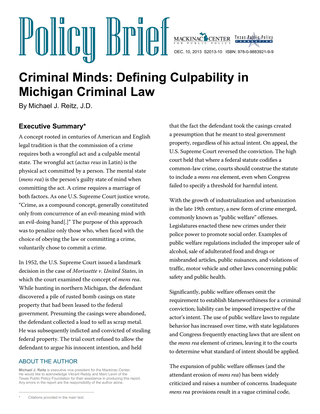 The Mackinac Center for Public Policy recently published “Criminal Minds: Defining Culpability in Michigan Criminal Law,” which addresses the element of intent in Michigan statutes and case law. The policy brief is authored by Mackinac Center Executive Vice President Michael Reitz.