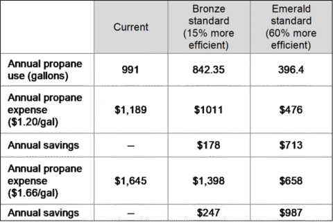 Assuming these energy efficiency upgrades reduce propane consumption by 15% for the bronze standard and 60% for the emerald standard, the average household would see the following impacts on their annual propane use displayed in Table 1.