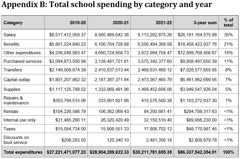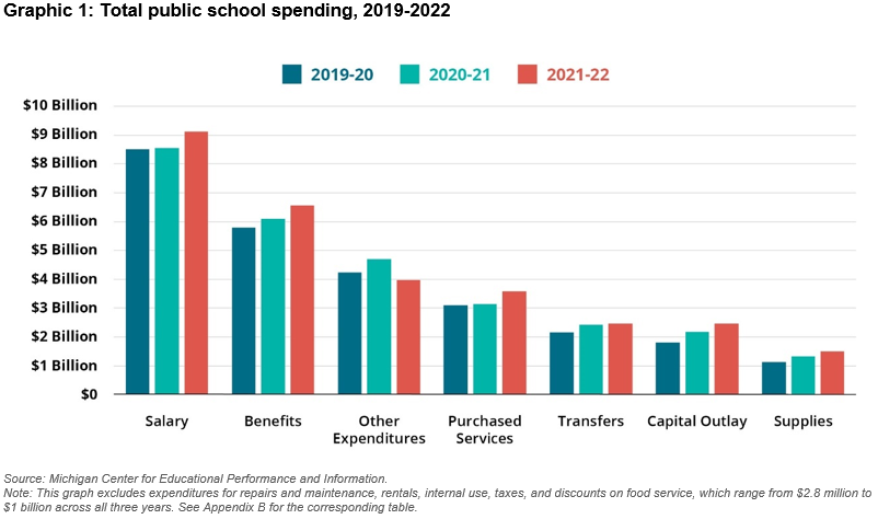 The graphic also shows an increase in spending over these three years. Michigan schools spent progressively more money in every category except on “other expenditures.” Between 2019-20 and 2021-22, spending increased overall by 11%, or $2.99 billion. While employee salaries and benefits, at $1.35 billion, represent the largest dollar value increase, spending on compensation increased by 9%, slightly less than the overall average.