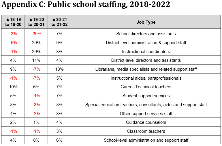 The number of teachers remained somewhat level, with an increase of 1% for all general education, special education and career and technical education teachers. That represents about 990 teachers. Interestingly, schools hired large numbers of career and technical teachers since 2019. Although the total number is small, with only 2,000 employed in 2022, staffing levels for career and technical teaching personnel have increased by 22% in three years and made up a third of the increase in teacher hirings over the period.