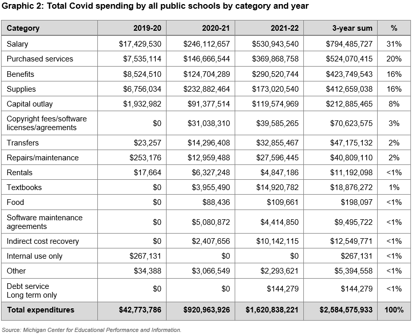 Most school districts are challenged with spending a lot of money fast. The expenditure data from Michigan’s Center for Educational Performance and Information allow for a closer look at how schools have used this money so far. Table 1 shows the statewide totals of how school districts reported spending their Covid relief funds from the last three school years: 2019-20, 2020-21 and 2021-22. This funding came from 19 Covid-related grants, which are listed in Appendix A.
