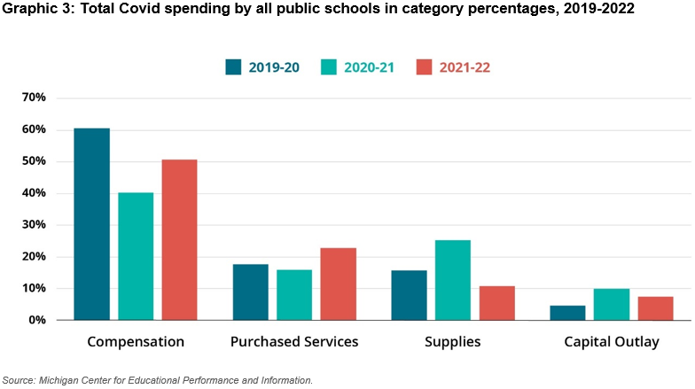 Between March 2020 and March 2021, the federal government distributed an unprecedented amount of money to American public schools to address the challenges of the Covid-19 pandemic. About $6 billion was distributed in three waves to the state of Michigan alone. This report uses data provided by districts to the state government to analyze how public schools in Michigan have reported spending their Covid relief funds. This financial information covers the three school years that ended in 2020, 2021 and 2022. The analysis finds that school districts reported spending about $2.5 billion of their $6 billion in Covid aid through the 2021-22 school year. The data generally show that districts allocated this extra revenue similarly to the way they typically spend resources — with about half devoted to employee compensation, a third for purchased services and supplies and the rest on capital costs and a variety of relatively minor expenses.