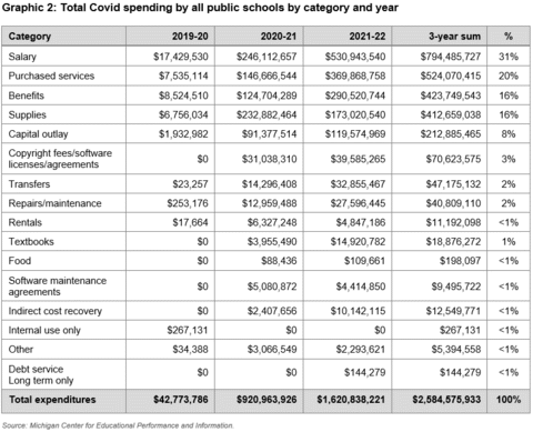Altogether, school districts spent $2.58 billion of their Covid funds across these three school years. This constitutes about half of the total Covid aid granted to Michigan school districts. Districts have until September 2024 to spend the remaining funds.