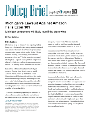 Michigan Attorney General Dana Nessel filed a lawsuit against Amazon in September 2023. She was joined by the Federal Trade Commission and 16 other state attorneys general. Nessel alleges that Amazon is operating as an illegal monopoly. This policy brief provides a close look at the legal complaint and argues that the case brought against Amazon is extremely weak and fails to take into account basic principles of economics.
