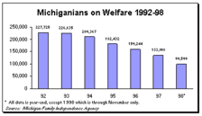 In Michigan last year, caseloads hit a 27-year low with the number of people on welfare falling below 100,000. While caseloads in the nation as a whole plunged 39 percent from 1993 to 1998, Michigans plummeted 49 percent. A greater percentage of welfare recipients in Michigan than ever before are working at least part-time, though achieving that has been expensive. Midland County, for instance, received almost half a million dollars from the state for child care and a bus system intended to increase the incentives for productive work. The