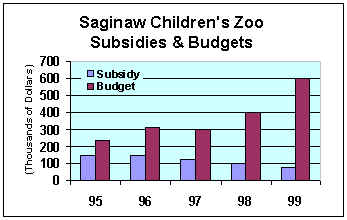 Originally intended to be one of Saginaws star attractions when the zoo was built in 1929, the city-owned and operated amenity had become a perennially low-priority slice of a cash-strapped municipal budget by the 1990s. Over the years, this contributed to a neglect of the zoo and its animals, which in turn affected the quality of the exhibits, which naturally depressed attendance and admission receipts, which ultimately resulted in a greater demand for more subsidies to keep the zoo afloat.