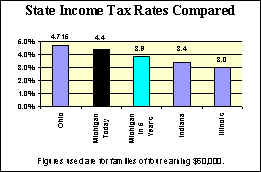 Cutting tax rates will also help make Michigan more competitive with other states. The personal exemption for a family of four in Michigan ($11,200) is already higher than in every other state except Mississippi, while a family of four earning $50,000 faces a higher top tax rate in Michigan than in 18 other states, including nearby Indiana and Illinois.