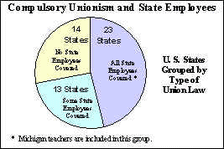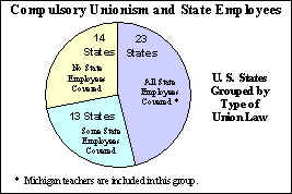 Clearly, there is a need in Michigan for a "Teachers' Bill of Rights." Its first order of business should be to grant individual teachers greater freedom to represent themselves or to choose an alternative collective bargaining agent. Mandatory union membership and compulsory dues as a condition of employment should be abolished, thereby making unions more responsible and accountable to their members. Michigan is one of only 23 states that cover all public sector workers with mandatory collective bargaining; 14 states do not force it upon any public sector workers at all, including teachers.