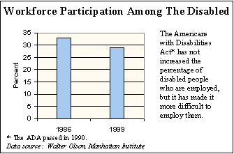 Some might argue that the abuse of the law, its resulting confusion, and the high costs of retrofitting the workplace to accommodate various handicaps, are all worth it if more disabled people are now entering the workplace. But indications are strong that disabled people are not big beneficiaries of the law because the ADA has made it very risky and costly for businesses to employ them. Economists at the Massachusetts Institute of Technology recently examined data from 1988 to 1997 and concluded,