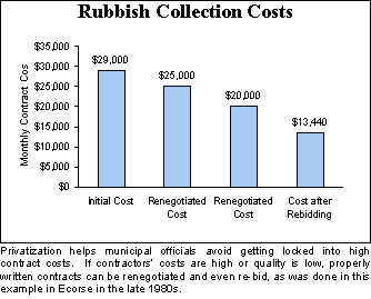 Thanks to privatization of public works, Ecorse no longer has to purchase and maintain expensive equipment such as street sweepers, snow plows, trucks, and various other machinery and supplies. The city contracts with a private firm whose workers now provide the services once performed by city employees. The private contractor knows that if its services are not what they ought to be, the contract may not be renewed. The city can take bids and award the contract to a new company. Schimmel estimates that since contracting out for services previously performed by DPW, Ecorse has saved well over $1 million each year.