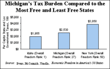 Where is Michigan in the economic freedom ranking? In the middle of the pack, at 27th among the 50 states. We have undoubtedly made some progress in recent months with the enactment of more tax cuts, and the Engler administration rightfully boasts of its successes in making Michigan more friendly to business and growth. Still, 26 states were ranked economically freer than Michigan. Among our neighboring states, only Indiana's rank of 22 was better: Ohio was 33rd, Illinois was 36th, Wisconsin was 37th and Minnesota was 43rd. When compared to all the states, clearly much more can be done to make Michigan a better place to live, raise children, and earn a living.