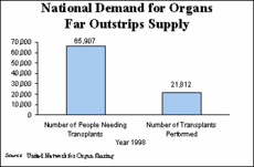 Michigan patients suffer from a critical shortage of transplantable human organs. Although the number of organ donors has increased from 534 in 1996 to 825 in 1998, demand for organs in Michigan continues to dwarf supply. More than 2,300 Michiganiansand roughly 67,000 people nationwideare currently waiting for organs. An estimated 4,000 Americans die each year because no kidneys, hearts, lungs, or other organs can be found for them.