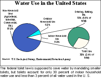 Advocates of the new toilets note that the old 3.5-gallon toilet accounts for 30 percent of (indoor) household water use, which sounds like a significant figure. However, when you include outside household water use in the total, this figure drops to 18 percent. If we then include all the water used by agriculture, industry, and commercial businesses, we find that household toilets account for a little over two percent of America's total water use.