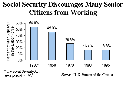 Today, we all know our work force is aging. We all know Americans are living longer and healthier lives than ever before. Life expectancy is now about 76, but in the next century some health experts think we could see average life expectancies of 100 years or more. And today's economy is beset not with unemployment but with a shortage of talented workers. Therefore, government should be encouraging seniors who want to continue to work past 65 to do so.