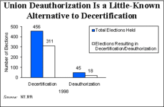 Deauthorization is far less common than decertification, and many workers may not realize that they have this option. According to NLRB data, 18 of the 45 deauthorization votes held in 1998 resulted in an actual deauthorizationa mere 40 percent. Of the 456 decertification elections concluded last year, 311 ended in decertificationa whopping 68 percent.