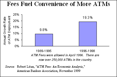 Consumers who use automatic teller machines (ATMs) at banks where they do not have personal accounts are increasingly familiar with this language: A fee of $1.50 will be charged for the use of this ATM. You may also be assessed a fee by your own institution. Do you wish to continue this transaction? Many state and local officials want to ban ATM fees, but such a move could actually deprive consumers of a valuable, convenient, and increasingly accessible service.