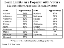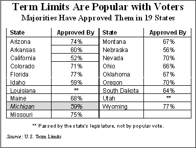 Opponents charged that limits were inherently anti-democratic, that people should be free to elect whomever they want to office and that voters already had the power to limit terms by simply voting incumbents out of office. It's clear, however, that most Michiganians felt that the system was a stacked deck that needed a corrective. They sensed something unfair about a system that allows incumbents to amass so much power and attention that challengers can rarely win. Moreover, we already fix all sorts of restrictions on who can hold office, no matter how popular they may befrom age and residency requirements to two four-year terms for the president.