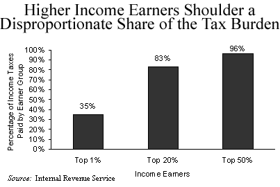 Another source of confusion about tax cuts stems from a misunderstanding of who actually pays the lion's share of income taxes under our federal system. If those in the top income brackets also pay the most in taxes, it makes sense that any tax cut is going to benefit them disproportionately. It just so happens that the top 1 percent of taxpayers pay 35 percent of all income taxes paid. The top 20 percent of all taxpayers pay 83 percent of all taxes. And the top 50 percent pay almost 96 percent of all federal income taxes.