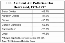 The U.S. Environmental Protection Agency reveals that nationwide levels of all six pollutants thought to adversely affect outdoor air quality have declined significantly since the 1970s. Between 1976 and 1997, ambient levels of ozonethe major contributor to urban smogdecreased 30.9 percent. Sulfur dioxide levelsthe primary component of acid raindecreased 66.7 percent, while nitrogen oxides decreased 37.9 percent, carbon monoxide decreased 66.4 percent, and lead decreased a dramatic 97.3 percent. Particulate matter, commonly known as dust and soot, decreased 25.5 percent since 1988, the first year for which particulate data are available. Most Michigan cities rate below national averages for air pollutants.