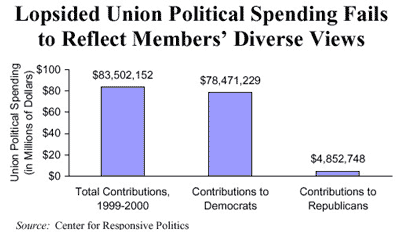 Unions collect an estimated $13 billion in dues each year to fund their various efforts, including political and other activities. But how much of that $13 billion is spent on collective bargaining and other core employee representation duties and how much goes to lobbying and other peripheral activities? Since unions are not required to make any meaningful disclosures of their political expenditures, it's impossible to say.