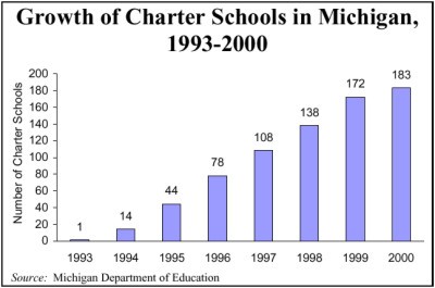Michigan's charter school efforts did enjoy some early success, but have now run into a brick wall. The state cap of 150 university-authorized charter schools was reached in 1999. During the 2000-01 school year, 3.4 percent of Michigan public school students were enrolled in charter schools. And even though Michigan citizens clearly want more charter schools, as evidenced by huge enrollment waiting lists and applications for new charters, the Michigan Education Association's lobbying efforts have ensured efforts to raise the cap have failed in the Legislature.