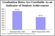 But before anyone gets too excited, we need to recognize that high school graduation rates have little or nothing to do with educational quality. The reality is that schools could have graduation rates of 100 percent and still have students who can't add, subtract, read, or write. A December 2001 Standard & Poor's study compared student achievement on standardized tests against graduation rates in Michigan schools. Eight out of ten students graduated, yet only six out of ten students scored in the "proficient" category on achievement tests.