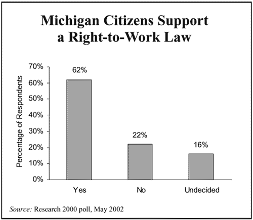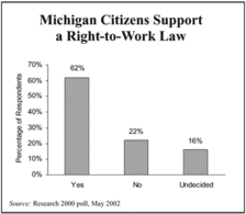 Michigan workers need not suffer from these political and economic disadvantages. In fact, there exists a substantial base of support for a right-to-work law, which garnered the approval of 62 percent of Michigan respondents in a recent poll conducted by Research 2000.
