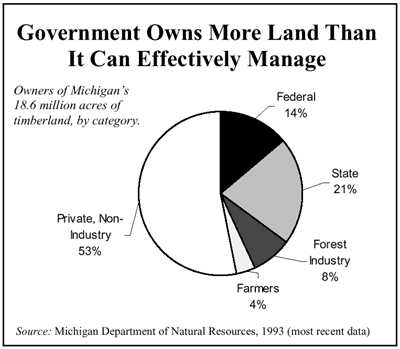 Think about it: Government—local, state, and federal—owns more land than it can properly manage. It owns millions of acres in Michigan, most of which have been placed off-limits to developers. Additionally, a large number of privately owned acres also have been rendered unusable, or nearly so, by various regulations. Why not offer compensation to property owners that grants them alternative sites on government-owned land when government sees fit to limit the possible uses for the owner’s land? This would help lighten the government’s land management load while, in many cases, appropriately compensating aggrieved property owners.