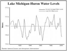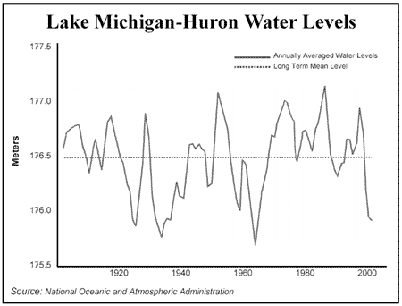 Lake levels fluctuate dramatically depending upon precipitation and air temperatures. Currently, lake levels are their lowest in three decades, with Lakes Michigan and Huron down by 3.4 feet and Lake Erie by 3.13 feet, according to the National Oceanic and Atmospheric Administration. The sediment exposed by receding waters is fertile ground for vegetation.