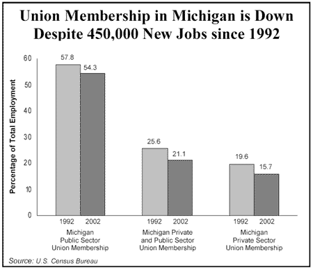 For Michigan, a manufacturing state, the declines have followed suit. Private-sector union membership in Michigan declined by 55,000 between 1992 and 2002, although the state gained 450,000 jobs in that period. The percentage of union members among private-sector Michigan workers declined from 19.6 percent in 1992 to 15.7 percent in 2002.
