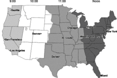People in the continental United States have become so accustomed to four standardized time zones — Eastern, Central, Mountain and Pacific — that it is hard to believe that we ever kept time any other way. But until a crucial date in 1883, what time it was depended on the nearest city or town. The time of day was a purely local matter, determined by the position of the sun. Noon was when the sun was at its highest point in the sky. Local people set their timepieces by some well-known clock in their respective communities, such as the one on a prominent church steeple or in a jeweler’s window.