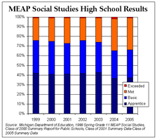 Social studies comprises a significant part of the Michigan Educational Assessment Program test taken by Michigan 11th graders. From 1999 to 2005, an average of only about 28 percent of test-takers met or exceeded state standards in social studies. This means that, on average, nearly three-quarters of students who graduated from Michigan public high schools in the past six years did not meet the state’s standard for knowledge of basic economics, world geography, and the history and institutions of the United States and Michigan. Admittedly, not each of these areas is required by the state for graduation, though they may be by local districts.