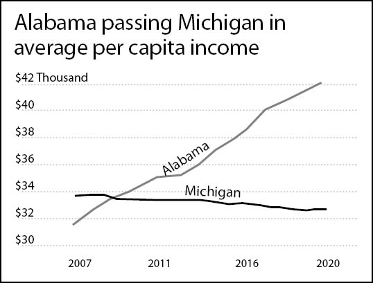 Right-to-work opponents say Michigan would become "an Alabama" if we end compulsory unionism. It’s true that Alabama’s per capita income is lower than Michigan’s, but Alabama is catching up fast. If the trends in both states continue, per capita income in Alabama will exceed Michigan’s in just three years. By 2016, residents in that right-to-work state will be earning $5,288 more than Michiganians on average.