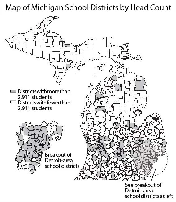 When I ran the numbers, I estimated that the maximum theoretical savings from breaking up excessively large districts, about $360 million annually, is 12 times greater than the theoretical savings from consolidations. Nothing close to those numbers is likely to be achieved in practice, though, since they would require redrawing the lines for every district in the state, replacing them all with about 570 new districts of 2,900 or so students each. Even if that were feasible, the mobility of the population would eventually throw district sizes out of whack once more. Realistically, a policy of selective breakups and consolidations would not put much of a dent in the $17 billion or so spent each year by Michigan public schools.