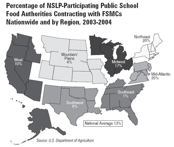 In the Great Lake State, food services have been the most popular school support function to privatize. In late 2006 and early 2007, the Mackinac Center surveyed all 50 states and determined that about 13.2 percent of conventional public school districts nationwide contract with a private firm to help manage or provide school food services. This is well below Michigan’s state-reported rate of 28.8 percent — the fourth highest in the nation — yet Michigan’s rate pales compared to Rhode Island at 86.1 percent and New Jersey at 64.4 percent. Clearly, even with food service contracting, Michigan school districts are not alone.