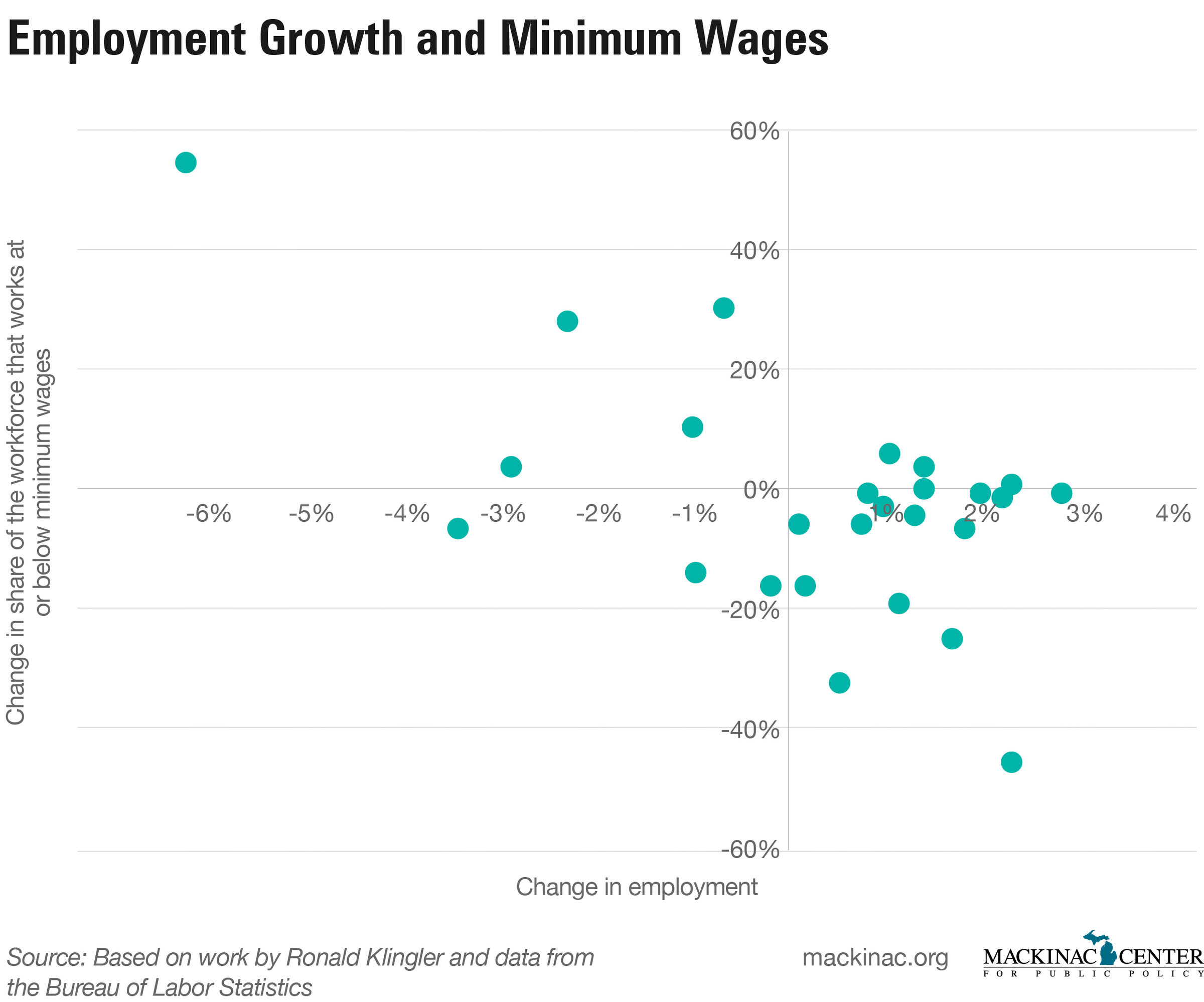 Large and sudden increases in the minimum wage have the potential to shock the economy and have ripple effects that hurt both low-wage workers and everyone else. Michigan’s increases, however, have been relatively small and gradual, so their effects have not been severe. The increases have done little to get more people working at minimum-wage jobs.