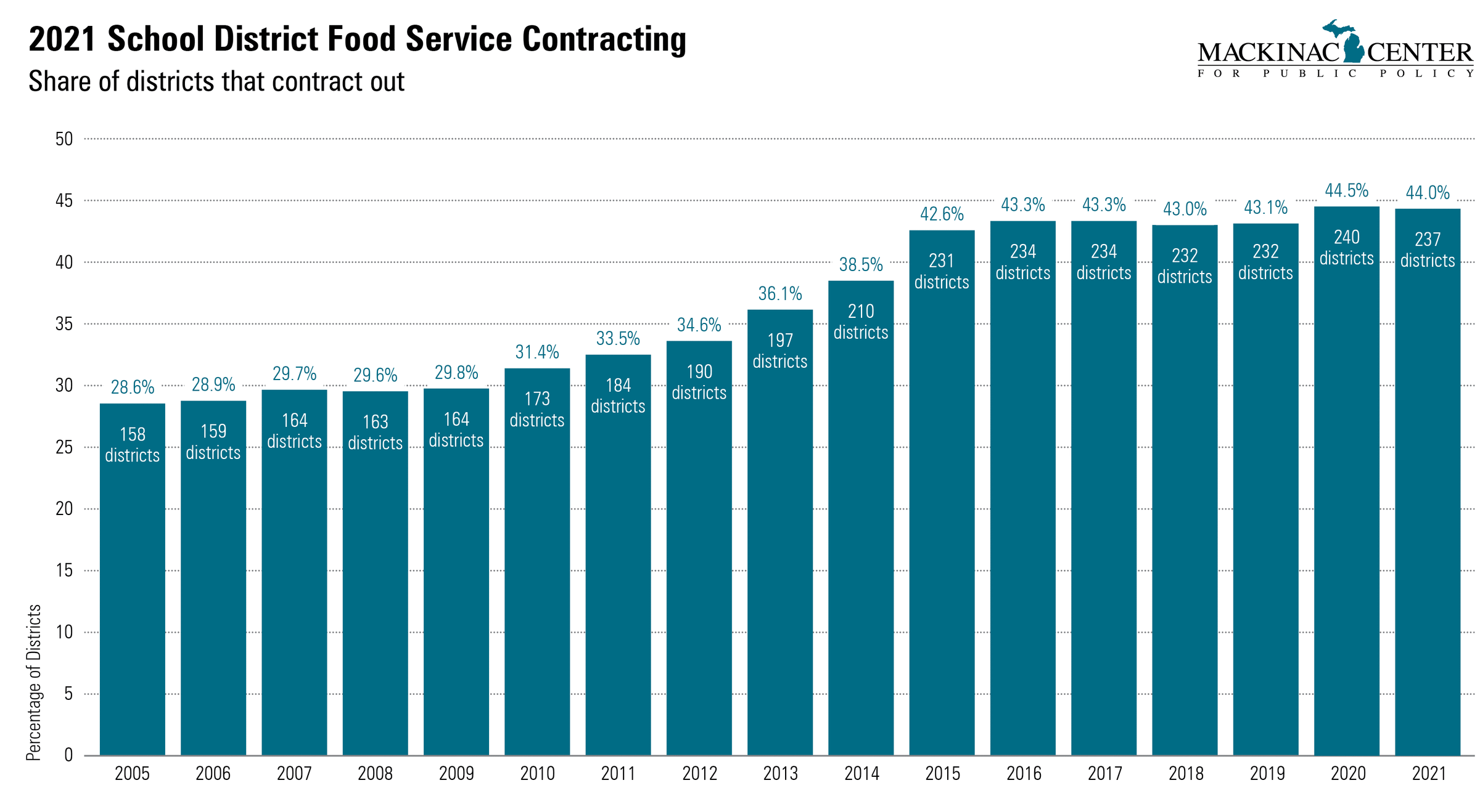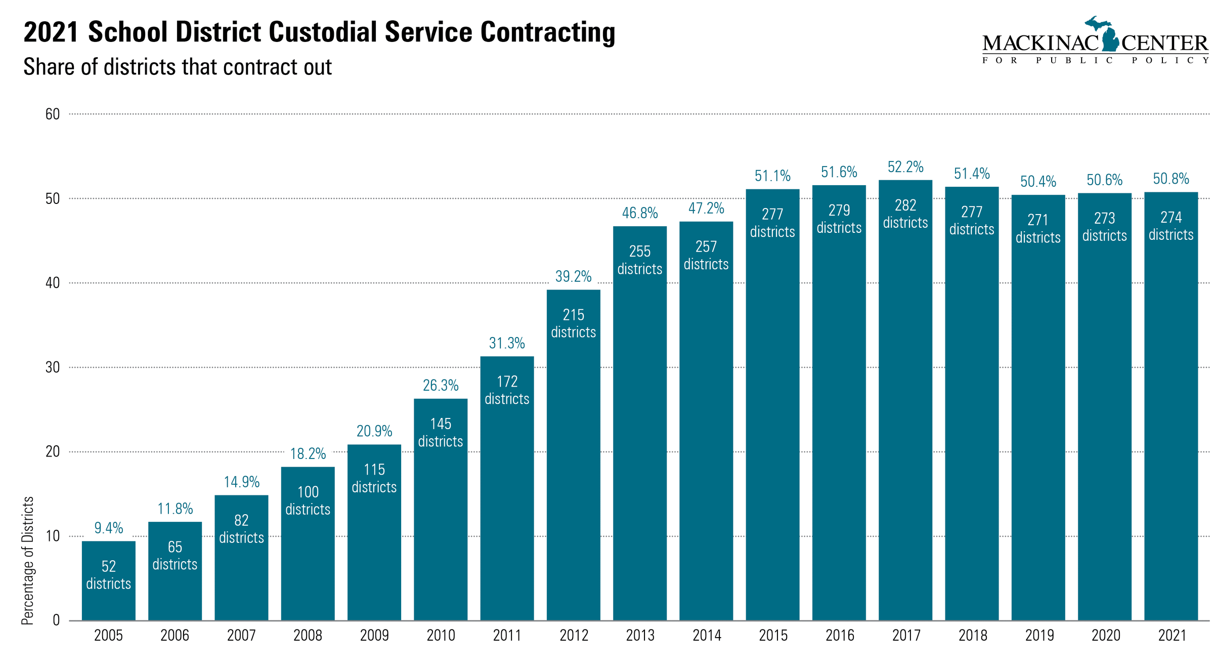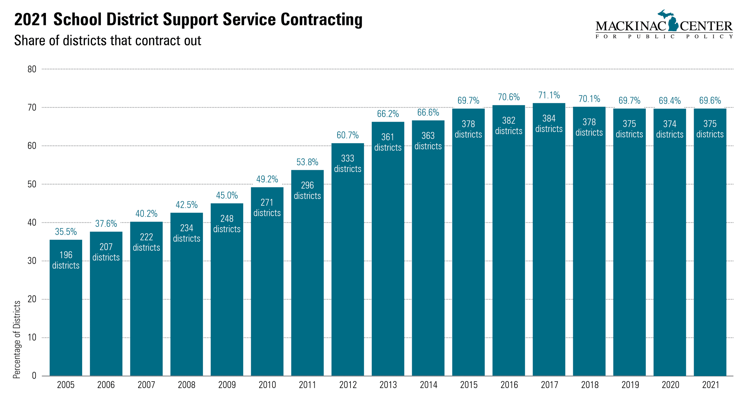 Of Michigan’s 539 public school districts, 375 contract out for food, custodial or transportation services, or 69.6% of districts. This is a small decrease from the peak levels in 2017, when 71.1% of districts contracted out. Contracting out has stayed at around 7 out of every 10 districts for the past 6 years.