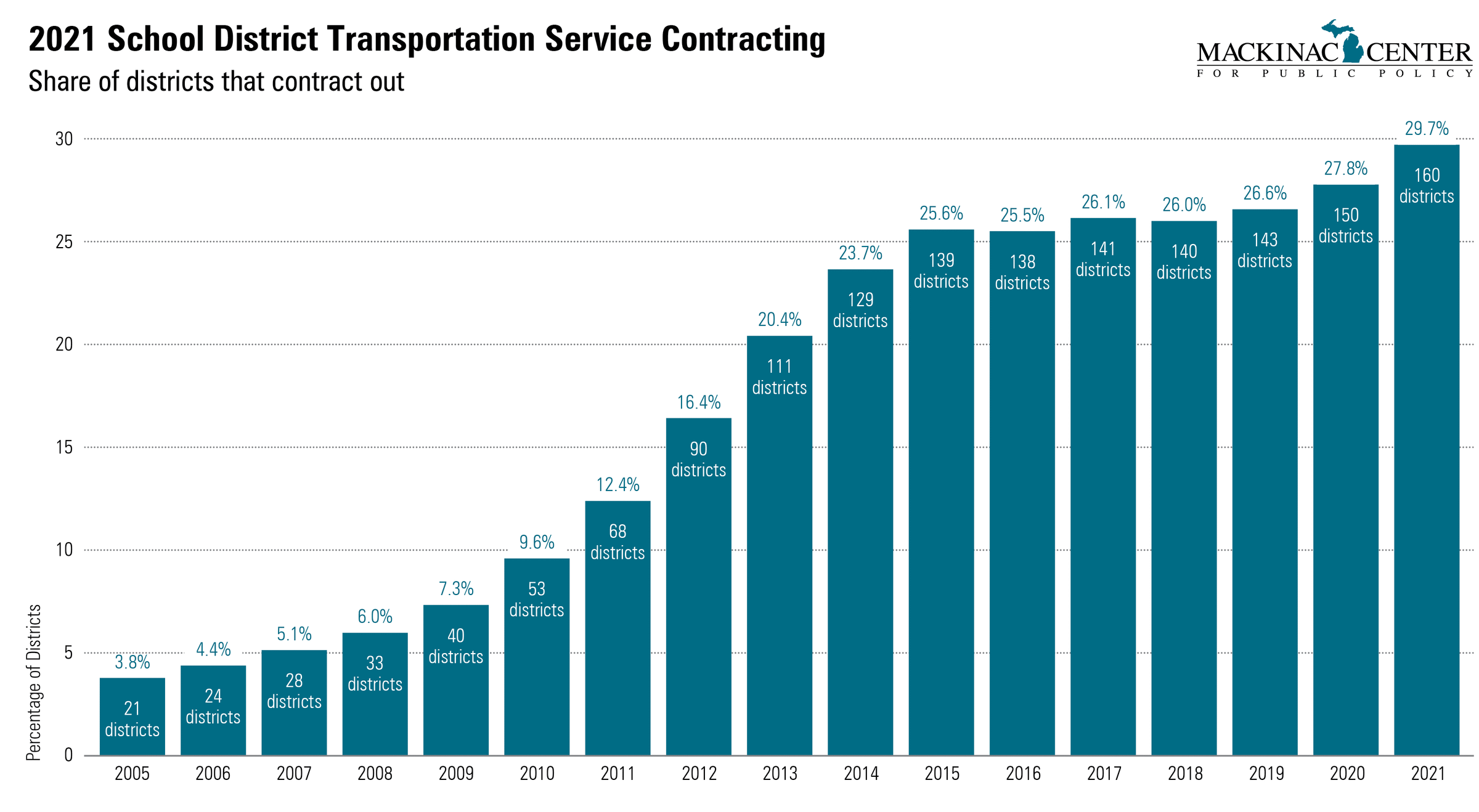 Contracting out with private companies to provide support services has been a time-tested way for school districts to save money and improve their operations. The Mackinac Center has surveyed districts going back to 2001 to find out just how many contract out for food, custodial and transportation services. We found that contracting increased from 31.0% of school districts in 2001 to 69.6% in 2021.