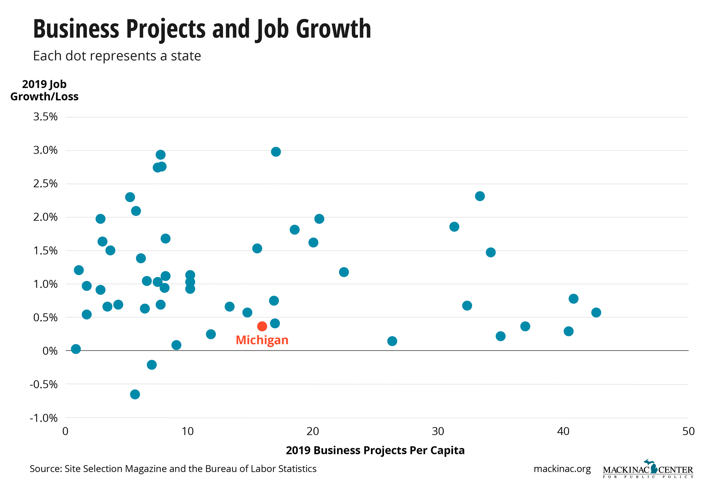 This can be seen in the data that gets used to announce the Governor’s Cup, which Site Selection magazine hands out to the state that has the most headline-worthy business projects. The magazine gets data about all of the announcements of business projects around the country. Comparing this data to job growth numbers reveals the weakness of an approach that tries to win the job war through selective business subsidies. States that get a lot of job announcements ought to grow more than states that don’t. Yet the connection between the two doesn’t exist. They’re simply unrelated. Job announcements don’t lead to jobs or lack of jobs. They just don’t matter.