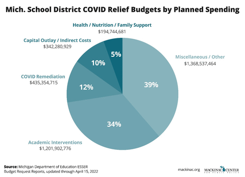Each budget item in district plans falls under one of 21 different allowable spending uses. Those uses fall broadly under five different categories: academic interventions; COVID remediation; nutrition, mental health, and family support; capital projects; and other. Through April 15, the miscellaneous category makes up 39% of planned expenses, or nearly $1.4 billion.