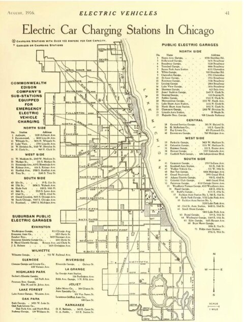 The monthly trade journal Electric Vehicles published a map in its August 1916 issue showing Chicago's network of electric car charging stations. That graphic indicates that the concept of battery electric vehicles is nothing new, and when CleanTechnica.com cited it last year many observers were surprised to learn that we have, almost literally, been down this road before. The e-vehicle industry of Woodrow Wilson's time was prominent enough to support many manufacturers and service providers who advertised in Electric Vehicles during what seems to have been a six-year run (a respectable life span for a publication even back then).