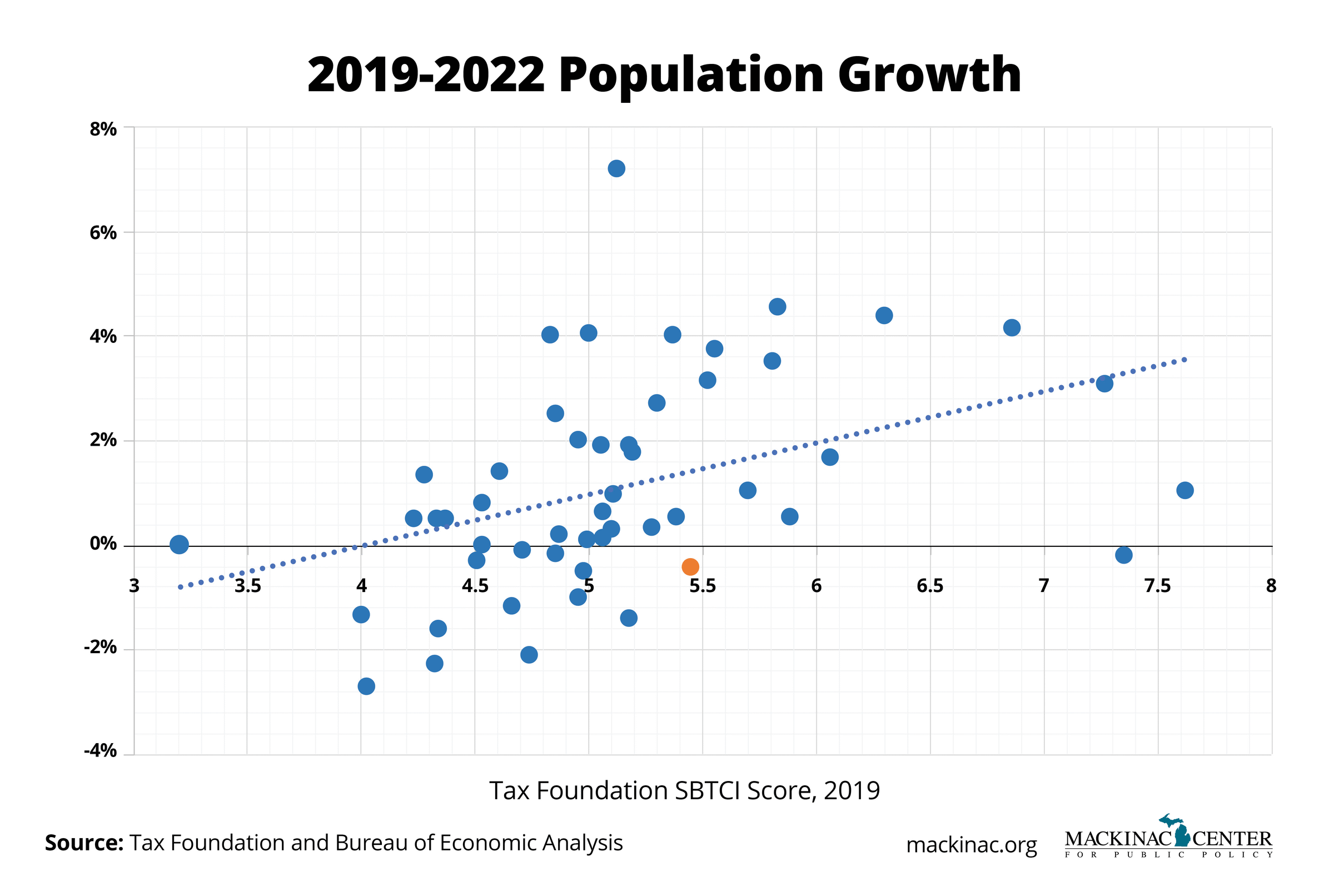 The relationship can be seen in the graph below. It compares each state’s population growth since 2019 against its score on the Tax Foundation’s State Business Tax Climate Index. The Tax Foundation gives states credit for having taxes with broad bases and low rates. Its index includes ratings for all the major taxes a state levies, not just business taxes.