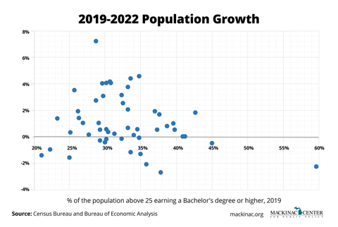 Doe argues instead that states with more educated populations increase their populations faster. This is incorrect. States that have more college graduates tend not to grow more than states with fewer college graduates, as the next chart shows. Take for example the vertical line that represents states in which 30% of the population has a degree. Some states grew by 4%, some barely grew, and some lost population.