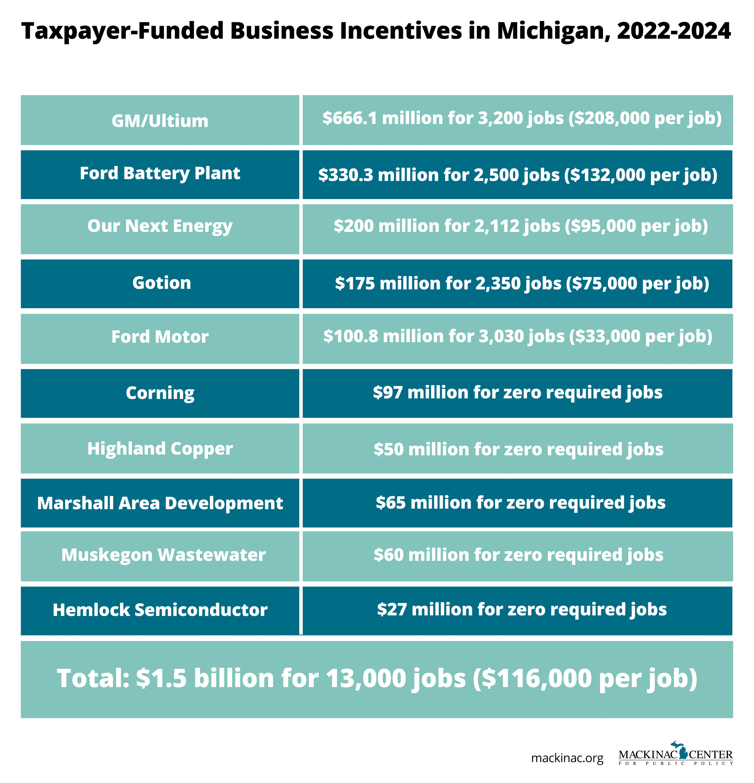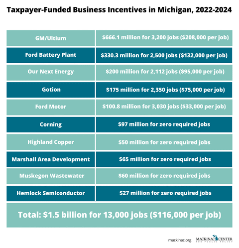 Keep in mind that these numbers are the best-case scenario. The history of Michigan’s corporate welfare apparatus shows that only a tiny percentage of the projected jobs are ever actually “created.”