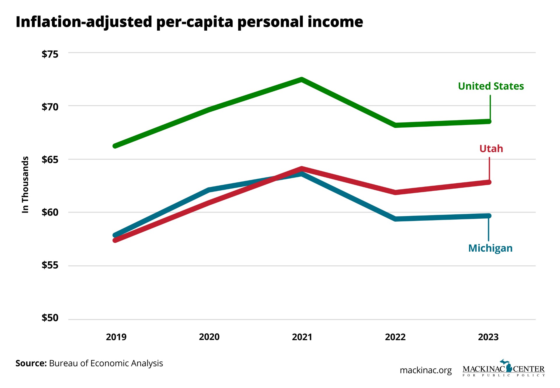 Michigan’s inflation-adjusted per-capita personal income increased from $57,900 to $59,714 from 2019 to 2023, a 3.2% increase. The state’s growth was below the 3.5% national average.