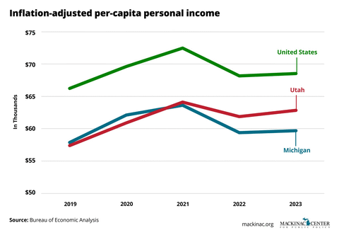Lagging growth is bad because Michigan incomes were below average in the first place. Michigan was ranked 34th in per-capita personal income in 2019 and fell to 39th in 2023. Missouri, North Carolina, Indiana, Utah, and Arizona surpassed Michigan’s average income levels. Michigan incomes are 12.9% below the national average.