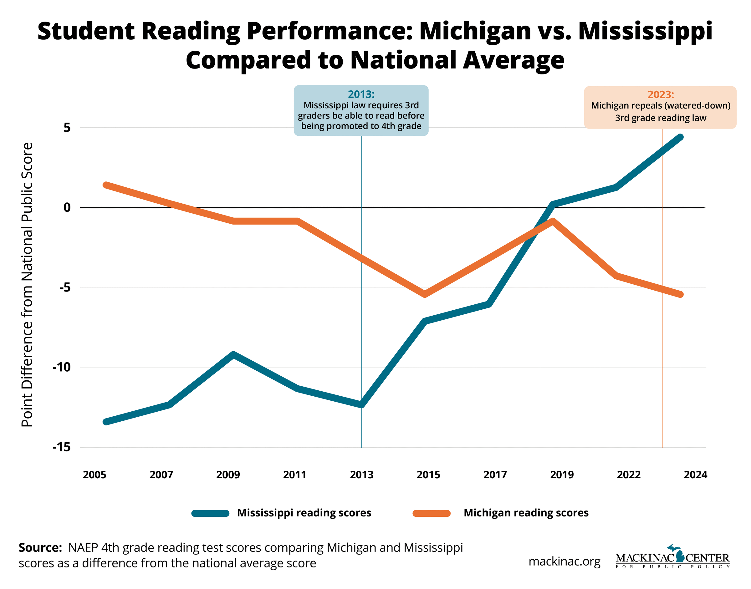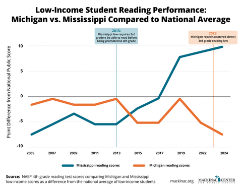 Mississippi outperformed Michigan and most other states on the most recent national fourth grade reading test. When factoring in socioeconomic status, its students surpassed Michigan's even more. Mississippi’s achievement gains come after the state adopted reforms that target literacy and school accountability. Michigan lawmakers repealed similar policies in 2023.