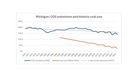Michigan's utility sector has reduced greenhouse gas (GHG) emissions without federal mandates, such as the CPS. According to the U.S. Energy Information Administration, Michigan's "Total Energy CO2 Emissions" decreased by 30%, from a high point of 200.2 million metric tons in 1973 to 141.1 million metric tons in 2023. The majority of this decrease was driven by improvements in generation technologies and market-driven transitions (or fuel-switching) from 1950s and 1960s-era coal-fired technologies to current-day natural gas technologies.