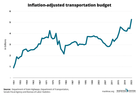 The chart includes transportation spending going back to 1951, when the state ran a highways department rather than the Michigan Department of Transportation. (For notes on methods and alternative measures, see my 2019 assessment.)
